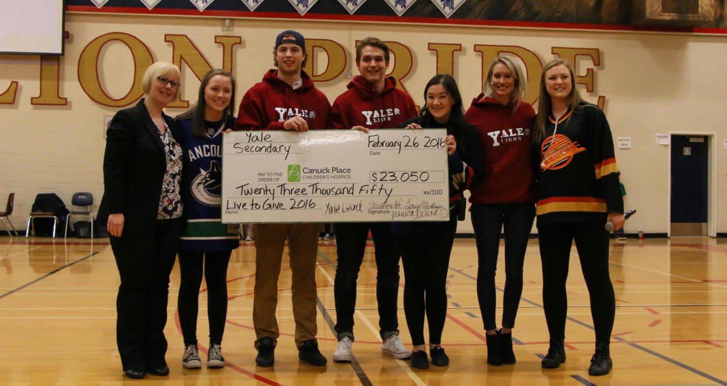 The Yale Secondary Leadership Program held its annual Live to Give fundraiser February 26th and it was another huge success. In total $23,370 was raised for Canuck Place in Abbotsford. The students organized a "lock in" with theme rooms such as karaoke room, games room, food room, man cave, ladies room, and even a giant slip and slide down the hallway. The evening began with a visit from Yale grad and Canucks TV host Hannah Bernard got the crowd of 300 students pumped up about the evening and then introduced Jake Virtanen and Ben Hutton from the Vancouver Canucks. The two Canucks complimented the students on working so hard fundraising for a such an important cause and spoke of their experiences visiting Canuck Place.